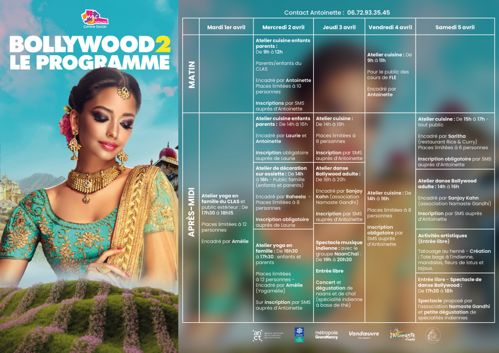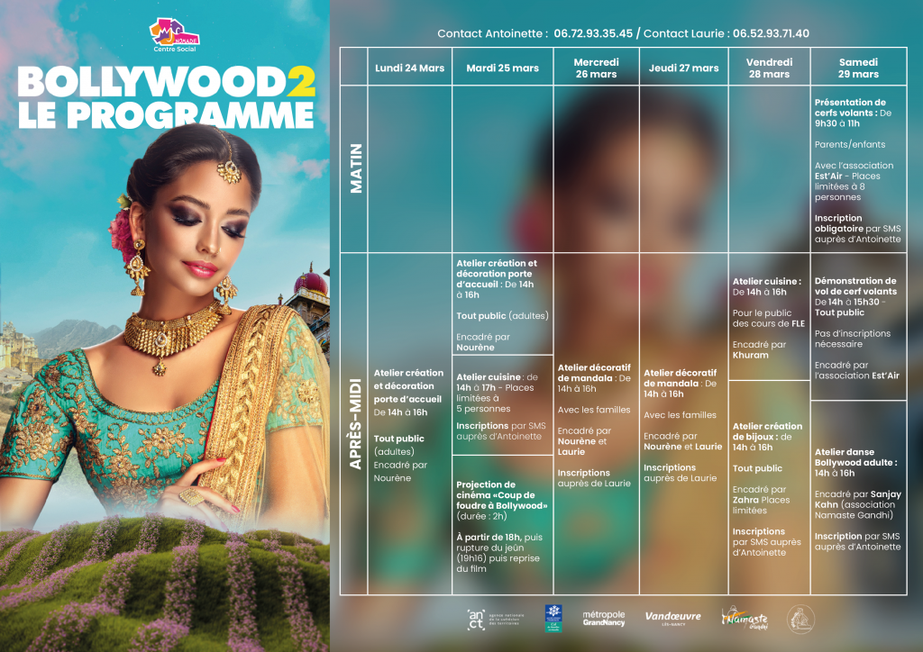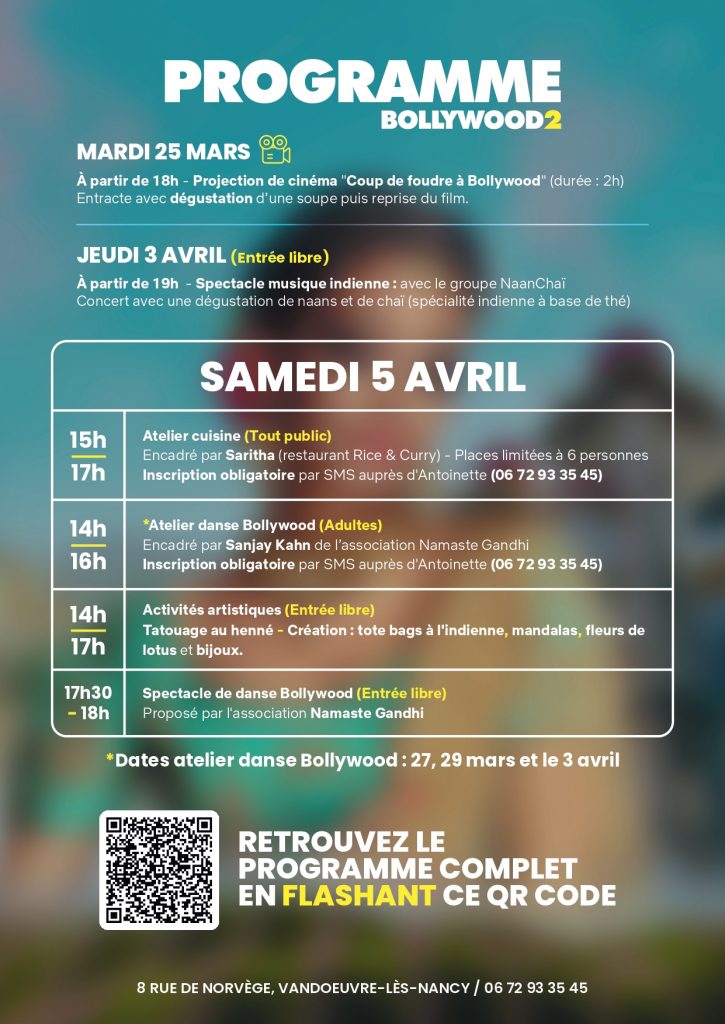Laissez-vous transporter avec le Festival Bollywood, une immersion unique dans cette culture haute en couleur. Découvrez des ateliers de création pour stimuler votre imagination, des cours de cuisine aux saveurs épicées, un stage de danse adulte Bollywood pour apprendre des chorégraphies dynamiques, une soirée cinéma indien, et un spectacle de danse envoûtant pour conclure en beauté.