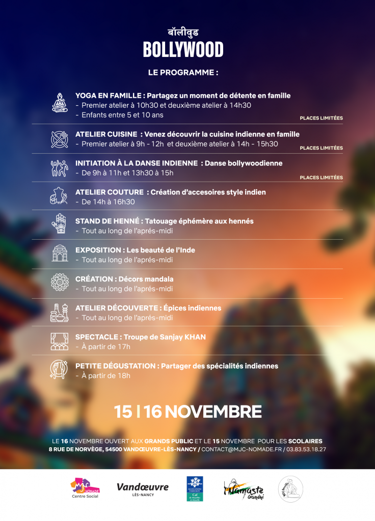 Le temps d’une journée, venez découvrir la culture indienne à travers divers ateliers et une initiation à la danse, suivis d’un spectacle entrainant.