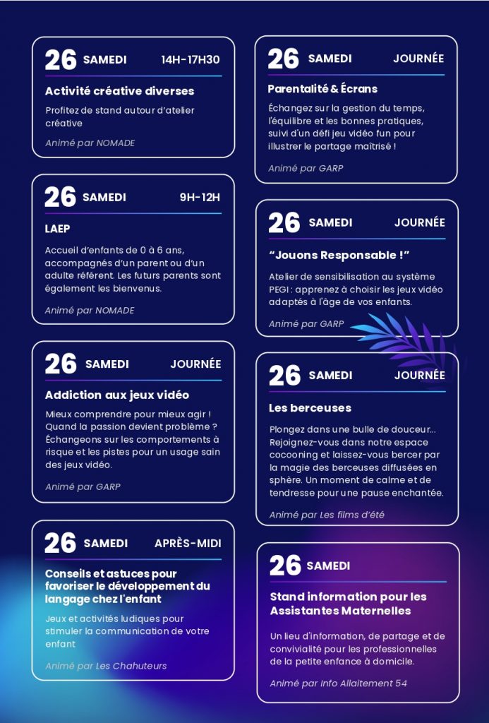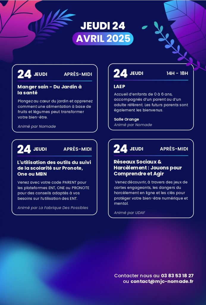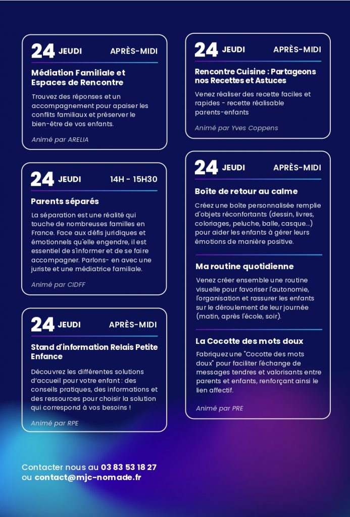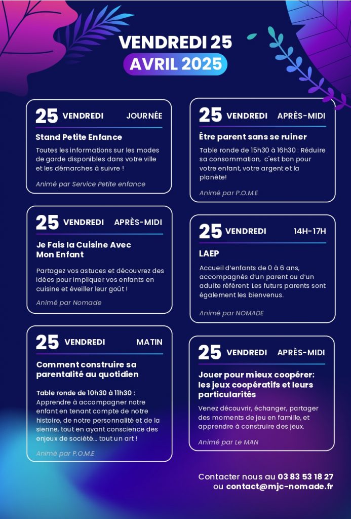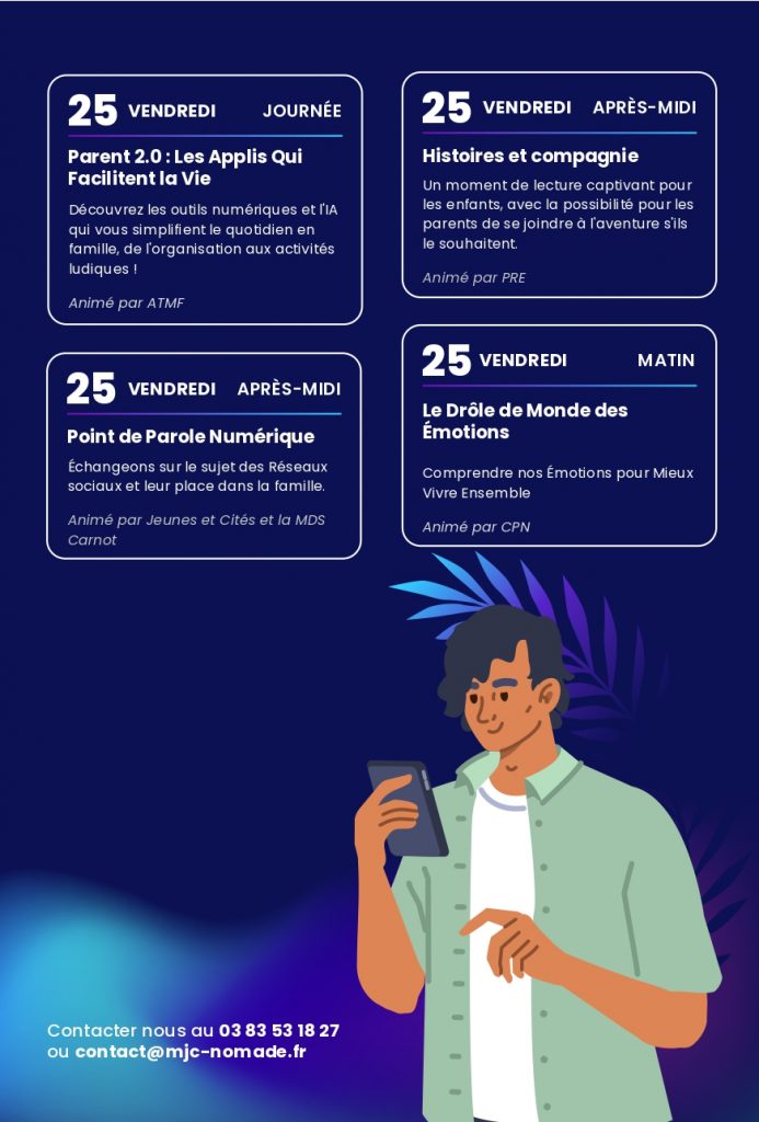 La MJC Centre Social Nomade vous invite à des journées d’échanges et de sensibilisation autour des thématiques essentielles de la santé, des relations parents/enfants, de l’éducation et de l’usage des écrans. Venez participer à des ateliers et discussions pour mieux comprendre les enjeux actuels et trouver ensemble des solutions adaptées à votre quotidien. À travers ces journées, des partenaires engagés animeront ces temps et proposeront des rencontres enrichissantes pour approfondir la parentalité d’aujourd’hui.