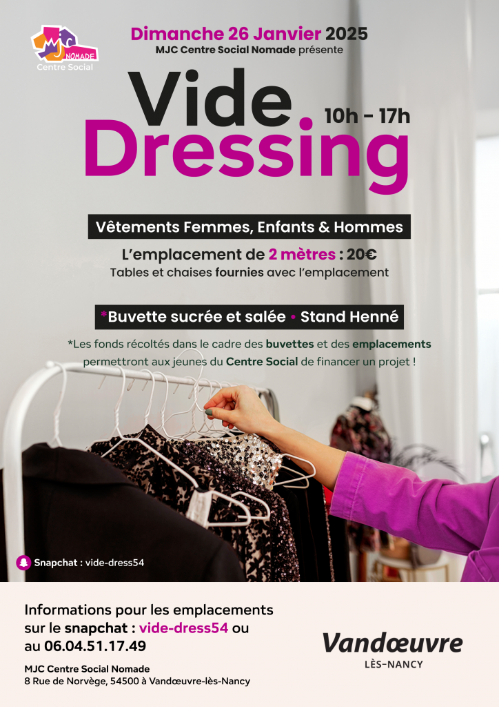 Il reste quelques emplacements disponibles pour 20 €, incluant 2 mètres avec table et chaises. Inscription uniquement au 06.04.51.17.49 ou sur Snapchat à vide-dress54.